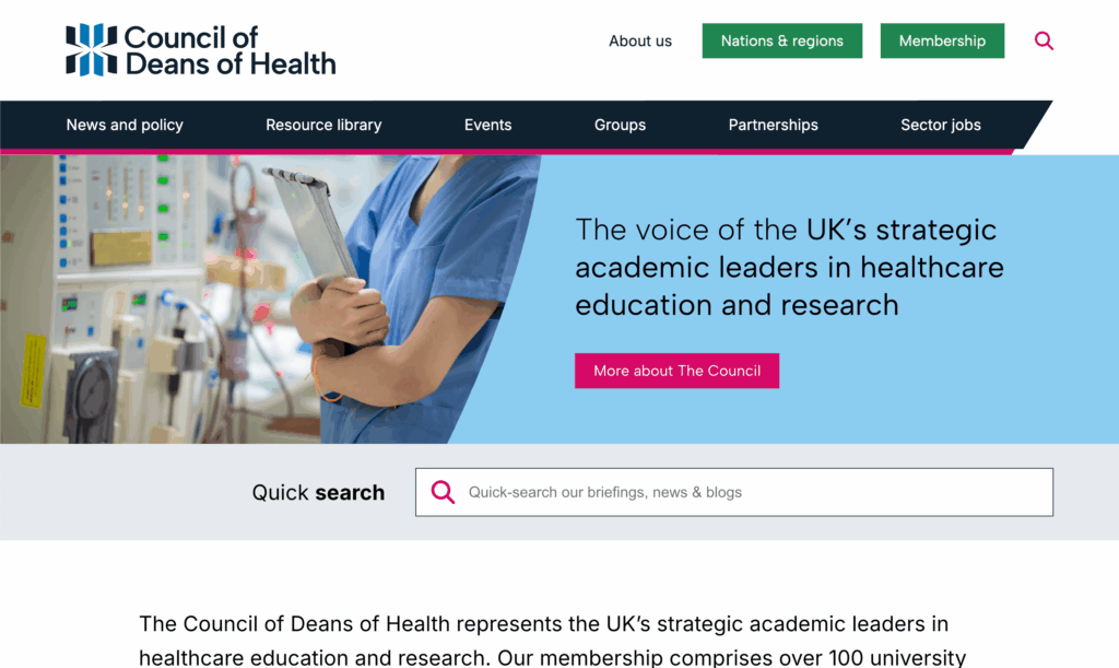 Council of Deans of Health represents the UK’s strategic academic leaders in healthcare education and research, supporting universities and organisations to strengthen public health and teaching across the sector.